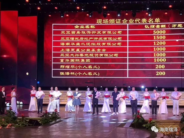 晚會(huì)上,王鐵明現(xiàn)場(chǎng)致辭,市領(lǐng)導(dǎo)為愛(ài)心企業(yè)和個(gè)人代表頒發(fā)榮譽(yù)證書(shū),海南瑞澤、景園集團(tuán)三亞分公司等6家愛(ài)心企業(yè)向三亞市教育基金會(huì)捐款2020萬(wàn)元人民幣,其中,海南瑞澤公司及董事長(zhǎng)張海林先生分別捐贈(zèng)200萬(wàn)元。三亞教育基金會(huì)首次為35名三亞優(yōu)秀學(xué)子和67名貧困優(yōu)秀學(xué)生頒發(fā)獎(jiǎng)學(xué)金、助學(xué)金。來(lái)自市一中、海南中學(xué)三亞學(xué)校、市一小、市九小等學(xué)校的老師和學(xué)生們上臺(tái)表演精心編排的文藝節(jié)目,表達(dá)廣大師生對(duì)三亞的熱愛(ài)和對(duì)夢(mèng)想的追求。截至8月19日,三亞教育基金會(huì)募集資金總額達(dá)1.75億元人民幣。嚴(yán)朝君向關(guān)心、支持三亞教育的愛(ài)心企業(yè)和社會(huì)各界表示感謝。他指出,三亞教育基金會(huì)的成立是三亞教育工作的一件大好事,相信三亞教育基金會(huì)必將為三亞教育事業(yè)的發(fā)展提供寶貴支持。各級(jí)黨委政府和全社會(huì)有責(zé)任和義務(wù),幫助孩子們實(shí)現(xiàn)就學(xué)夢(mèng)想,從而報(bào)效國(guó)家、為社會(huì)作貢獻(xiàn)。希望通過(guò)晚會(huì)宣傳動(dòng)員引導(dǎo)全社會(huì)更多的愛(ài)心企業(yè)、愛(ài)心人士,能夠更加關(guān)注教育、關(guān)心教育、支持教育,為三亞教育事業(yè)發(fā)展添磚加瓦。
