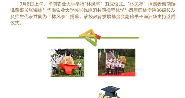 10:30華南農(nóng)業(yè)大學(xué)校友會風(fēng)景園林行業(yè)分會在華農(nóng)紅滿堂隆重舉行成立大會,張海林先生當(dāng)選首屆會長。董事長在致辭中表示:園林專業(yè)是學(xué)校明星專業(yè)之一,實踐素有“北有北林,南有華農(nóng)”之美譽。風(fēng)景園林行業(yè)分會的成立,是希望能在知識邊界擴展的今天,能建立一個新的組織,凝聚華農(nóng)園林人力量,校友們能互相幫助,互相合作,凝心聚力,融合發(fā)展。