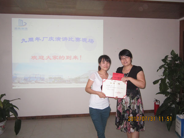 2012年7月31日,為慶祝海南瑞澤新型建材股份有限公司成立九周年,公司總裁辦公室特舉辦九周年廠慶演講比賽,公司廣大員工踴躍報名參加,用詩歌、散文等各種形式來抒發(fā)對公司未來發(fā)展前景的期待。比賽結(jié)束后,經(jīng)過評委們公開、公正、公平的評分,最后陶美霞等10名員工獲獎,最后公司相關(guān)部門領(lǐng)導對獲獎員工頒發(fā)榮譽證書和獎品。
